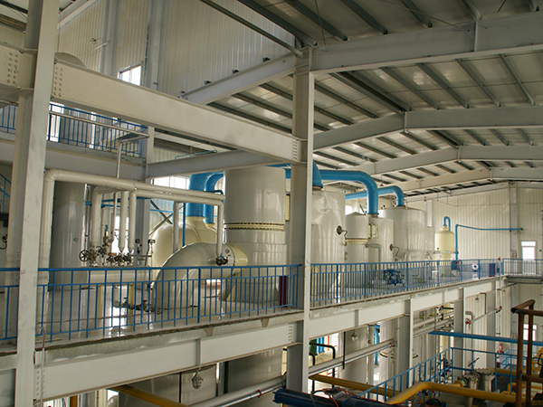 Este proceso implica el uso de un evaporador, la torre de decapado de disco, el separador de destello, el intercambiador de calor, y una unidad de vacío. Bajo una condición de vacío y presión negativa, el disolvente de la micela se evapora y se separa mediante una evaporación de película ascendente y un proceso de decapado directo. Tras la desolventización, se obtiene un colorido aceite lixiviado. Para garantizar la estabilidad y fiabilidad del sistema, se utiliza un sistema de control PLC automático que controla la temperatura de evaporación y el nivel de vacío. Para la evaporación se utiliza tanto el vapor mixto como el vapor potente para la bomba de vacío. La transferencia de calor y transferencia de masa entre el medio de enfriamiento y de calentamiento reduce aún más el consumo de vapor, lo que también evita la oxidación de los lípidos.